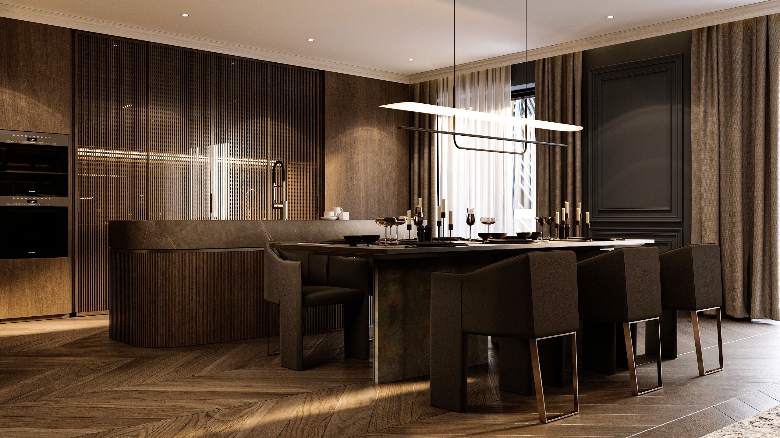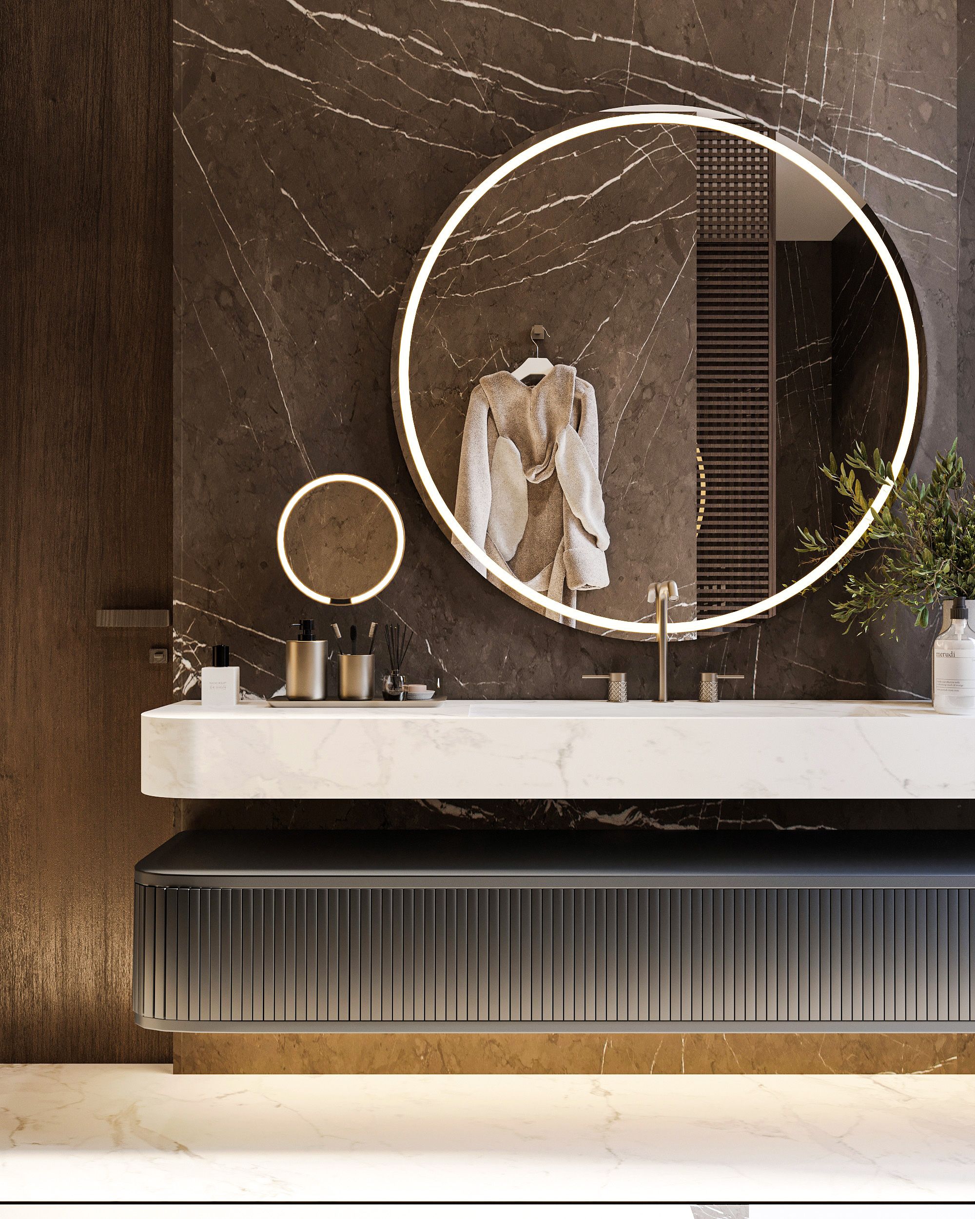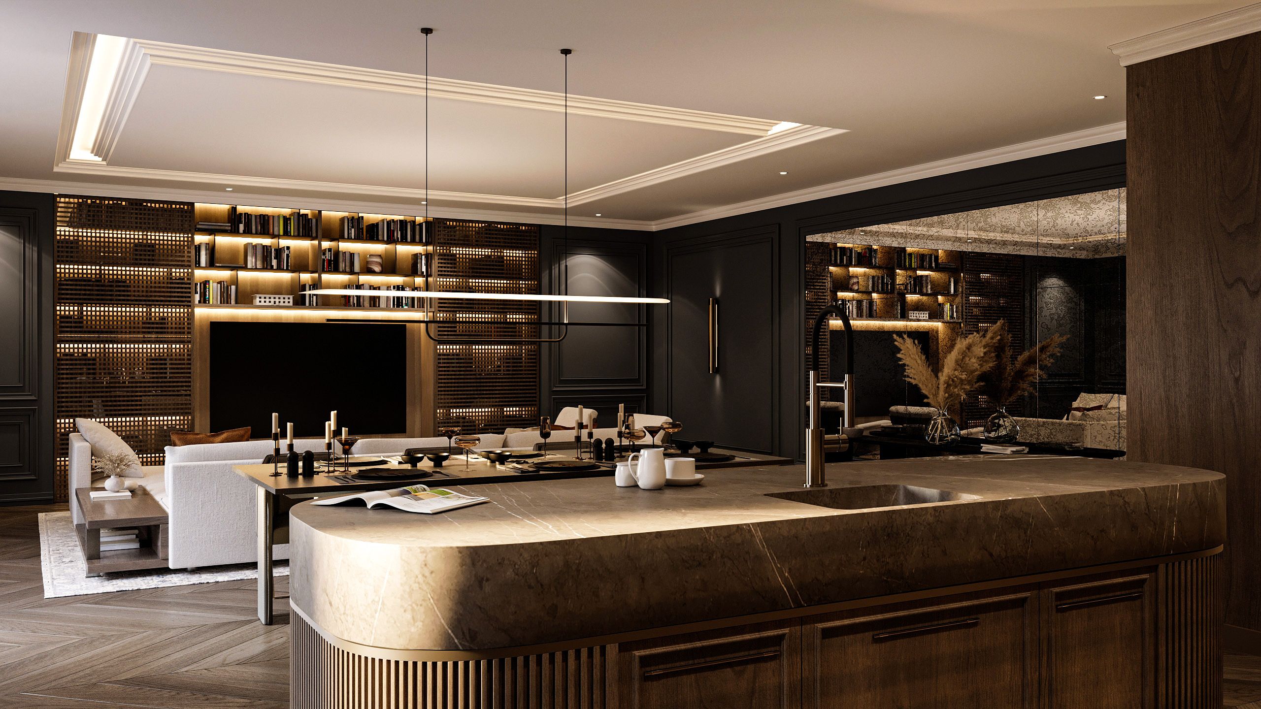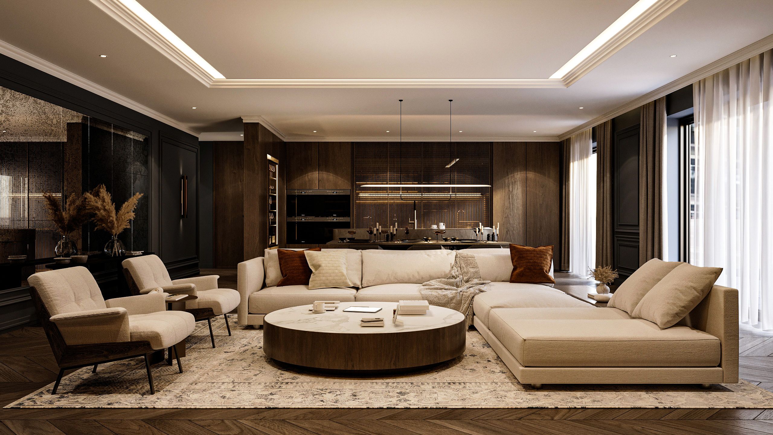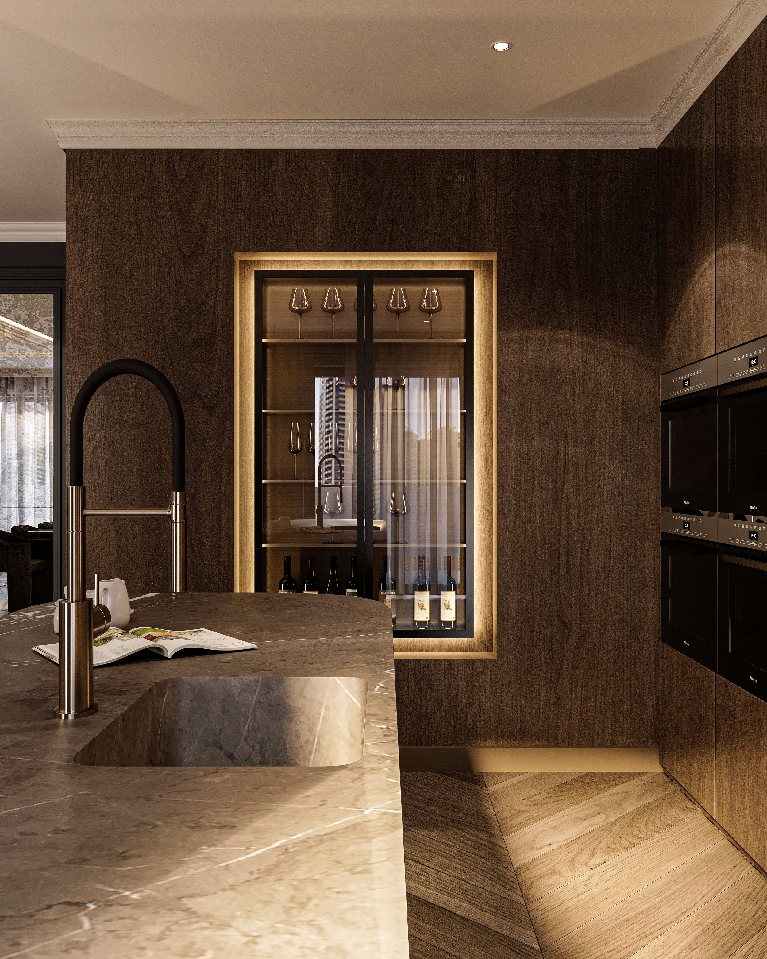 Warm wood finishes play a central role throughout the space, adding depth and continuity—from the custom wall paneling to the integrated kitchen and bedroom details. Subtle lighting design enhances textures and creates a soft, ambient glow, particularly in feature elements like the sculptural bathroom basin and backlit mirrors. Carefully curated furnishings in neutral tones bring balance and comfort, complementing the rich material palette. The result is a harmonious interior that blends classic proportions with modern living, where every detail feels intentional and quietly luxurious.