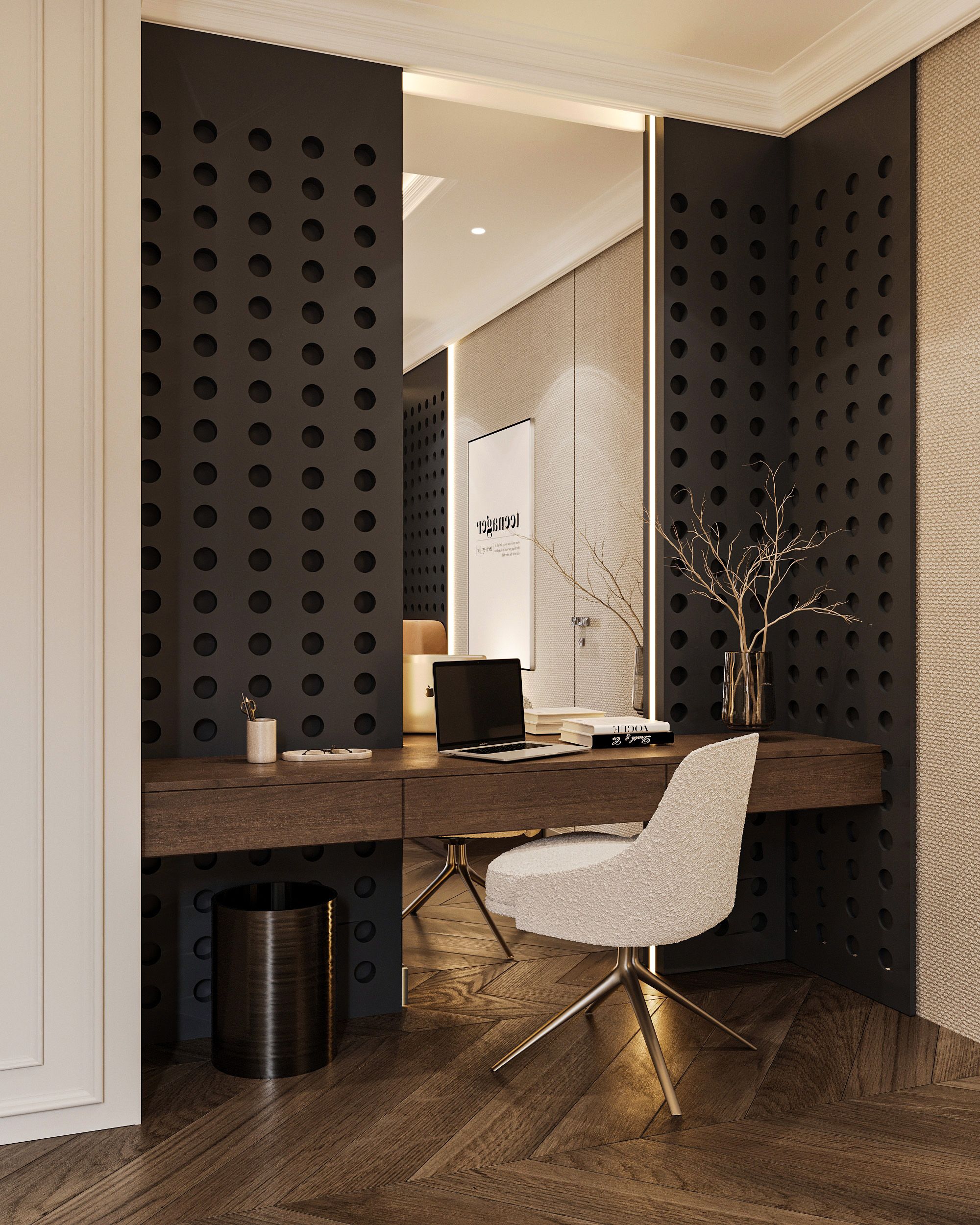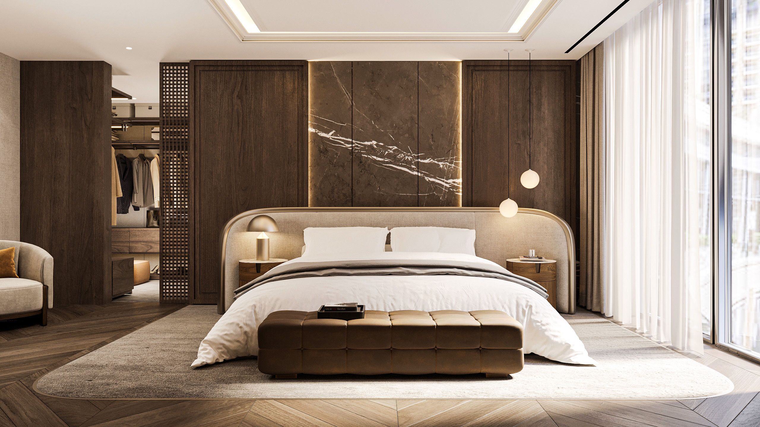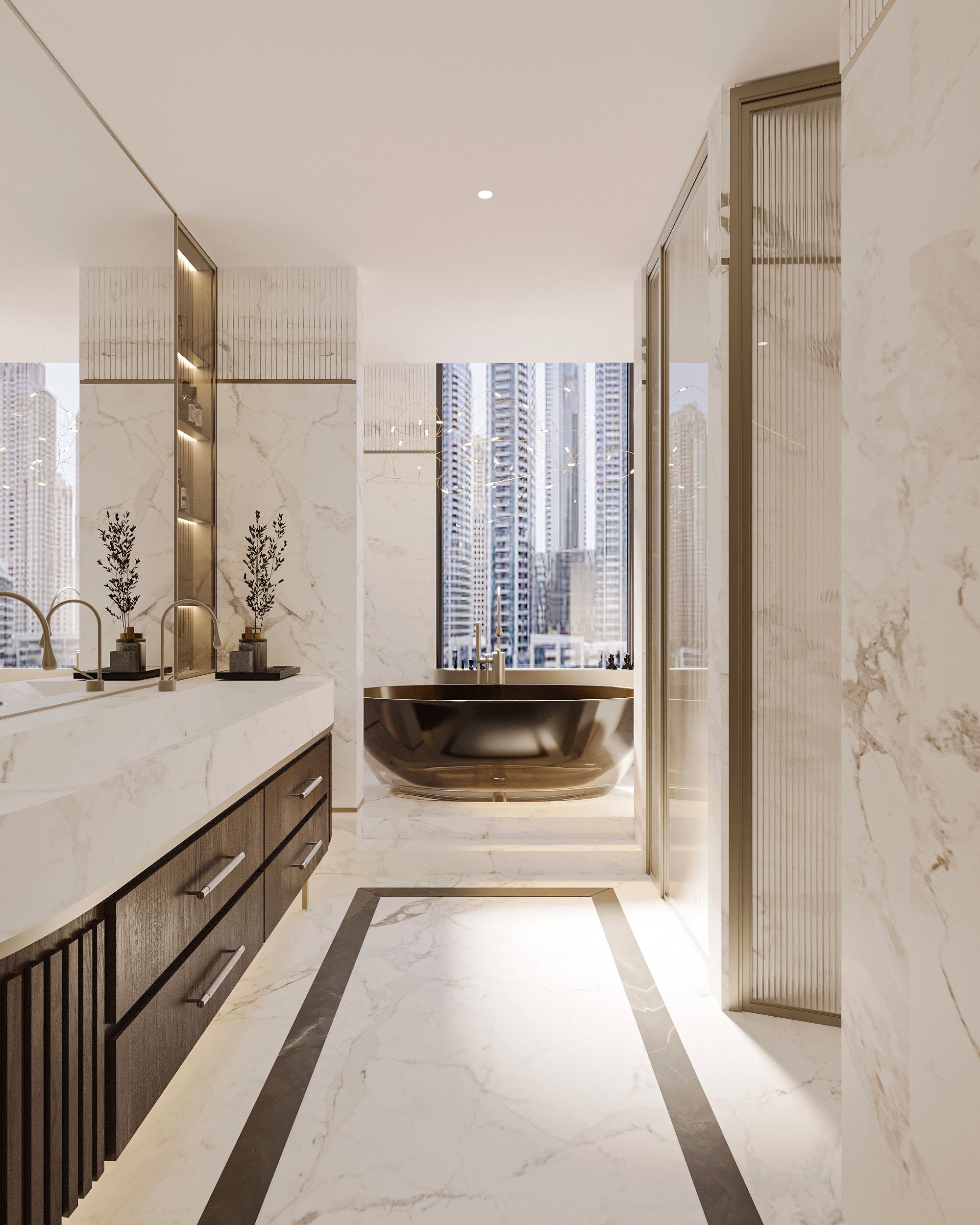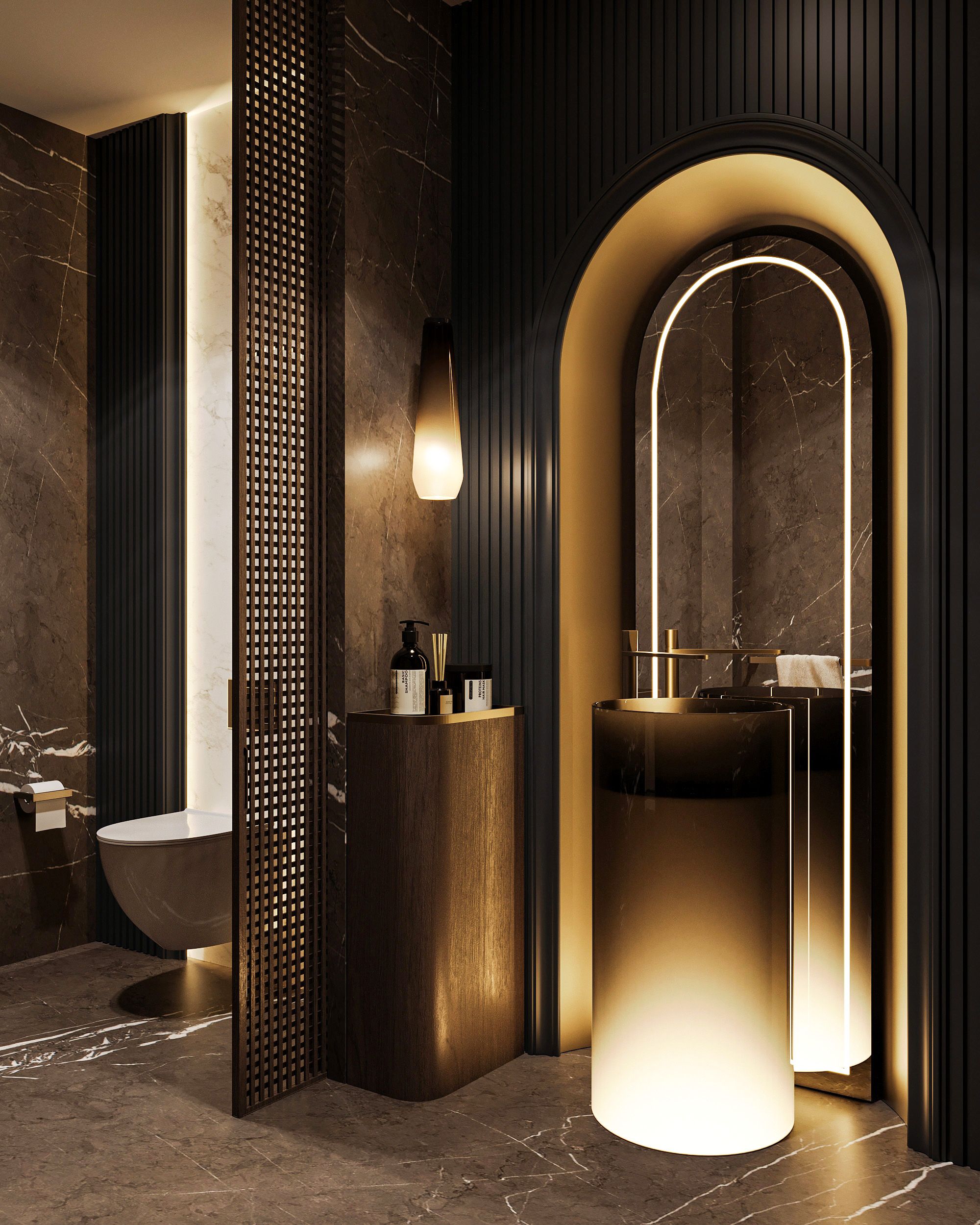 Warm wood finishes play a central role throughout the space, adding depth and continuity—from the custom wall paneling to the integrated kitchen and bedroom details. Subtle lighting design enhances textures and creates a soft, ambient glow, particularly in feature elements like the sculptural bathroom basin and backlit mirrors. Carefully curated furnishings in neutral tones bring balance and comfort, complementing the rich material palette. The result is a harmonious interior that blends classic proportions with modern living, where every detail feels intentional and quietly luxurious.