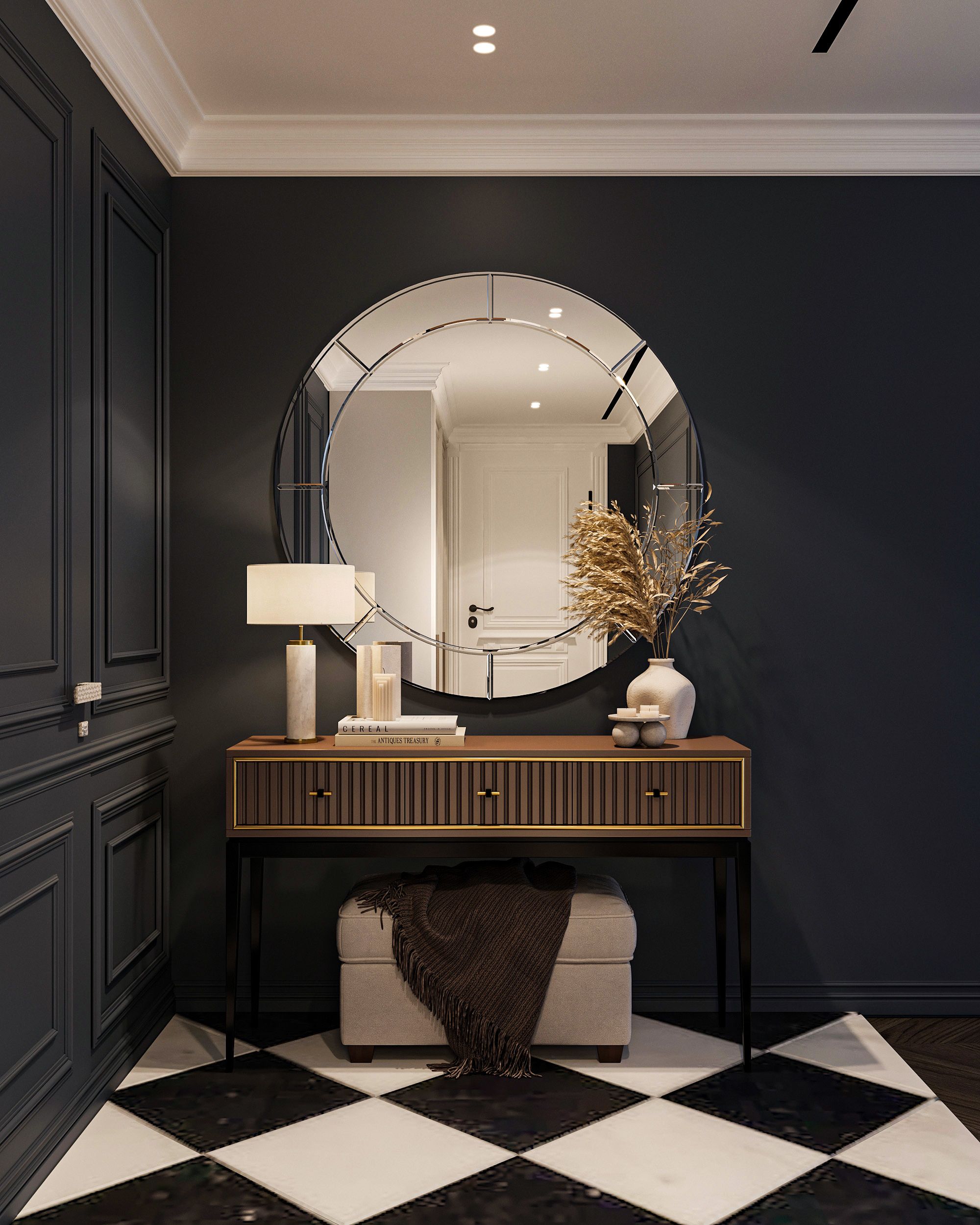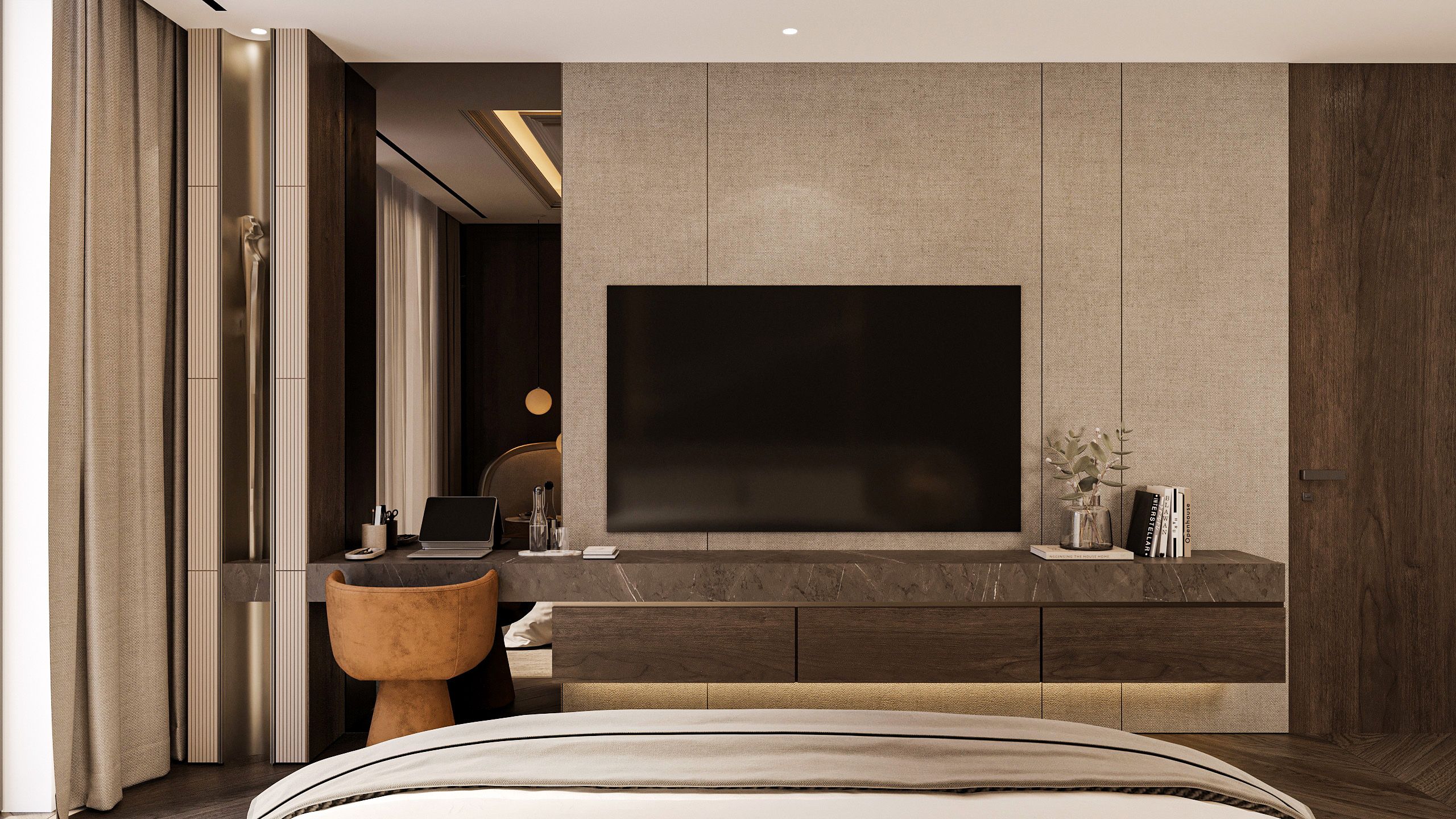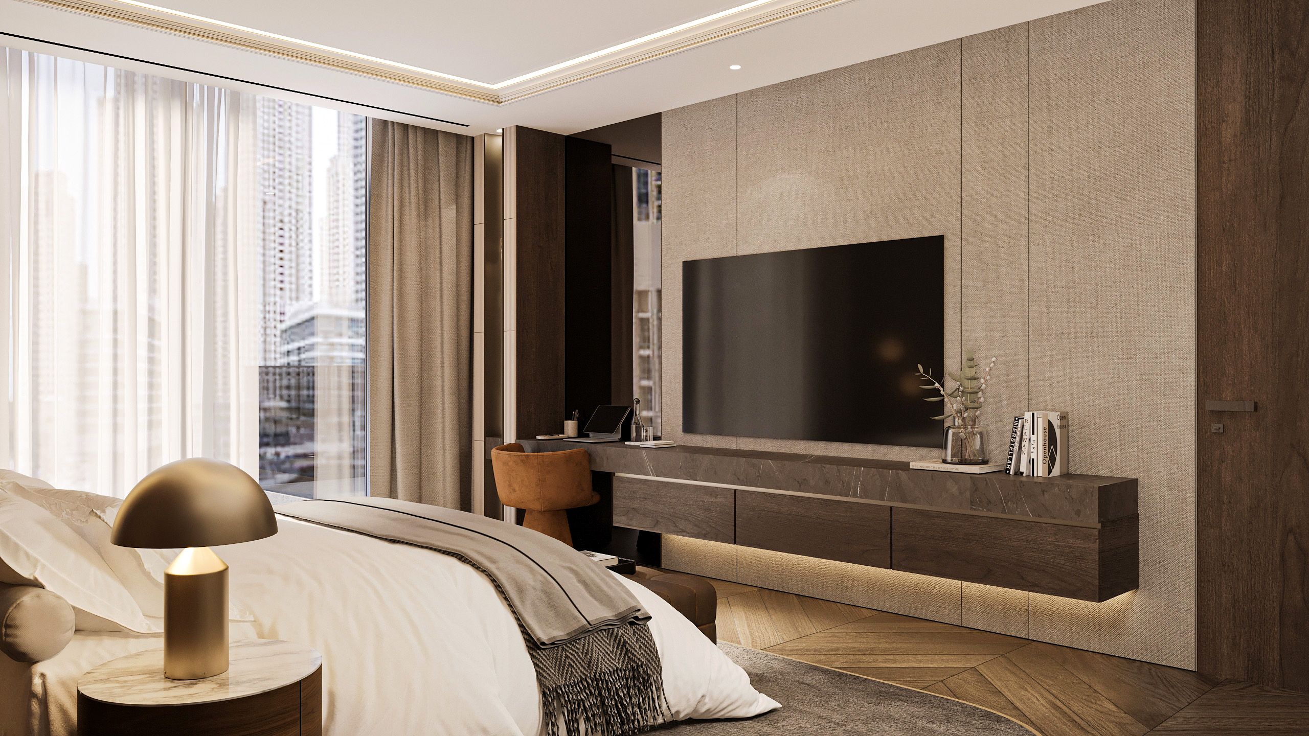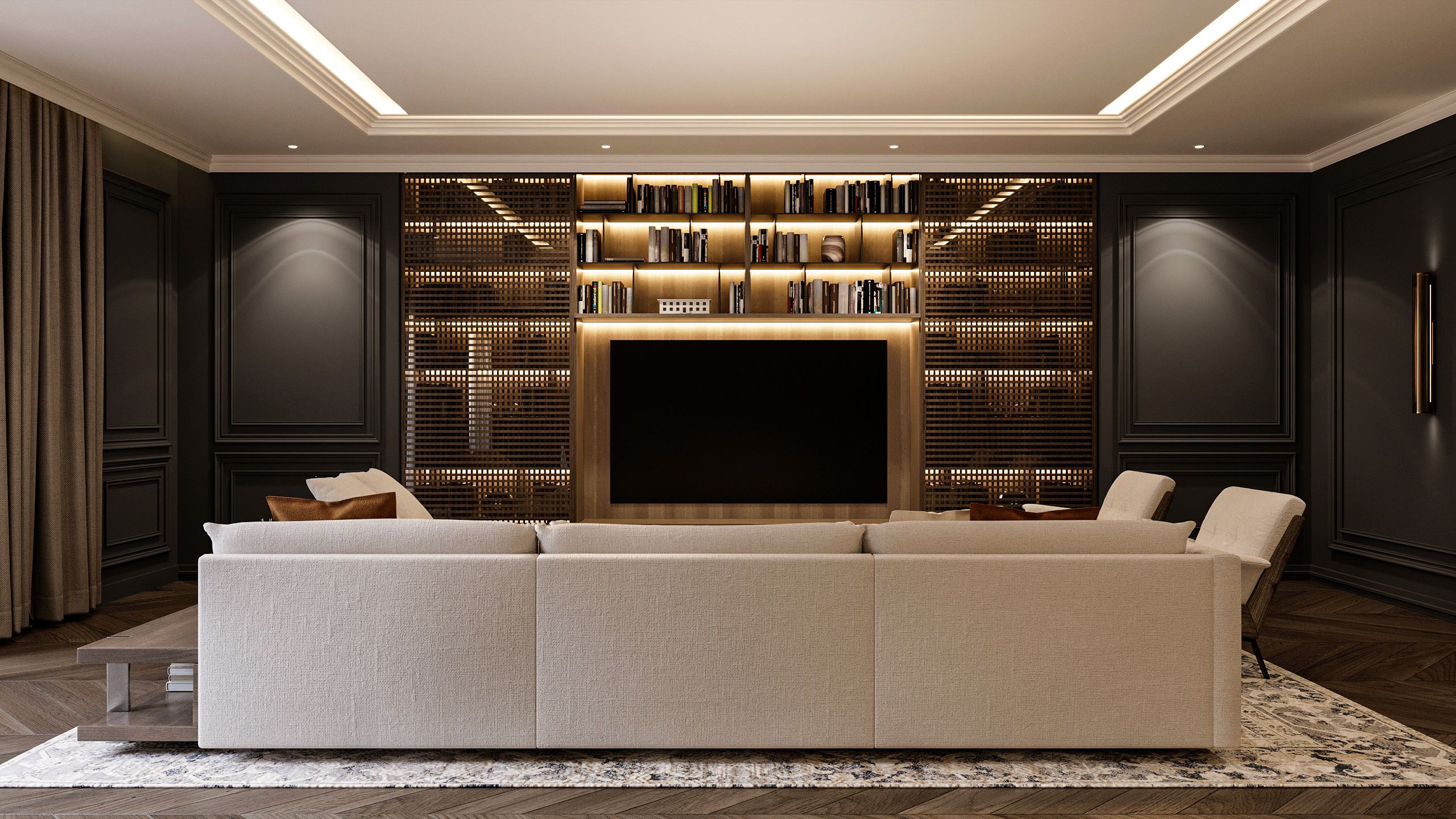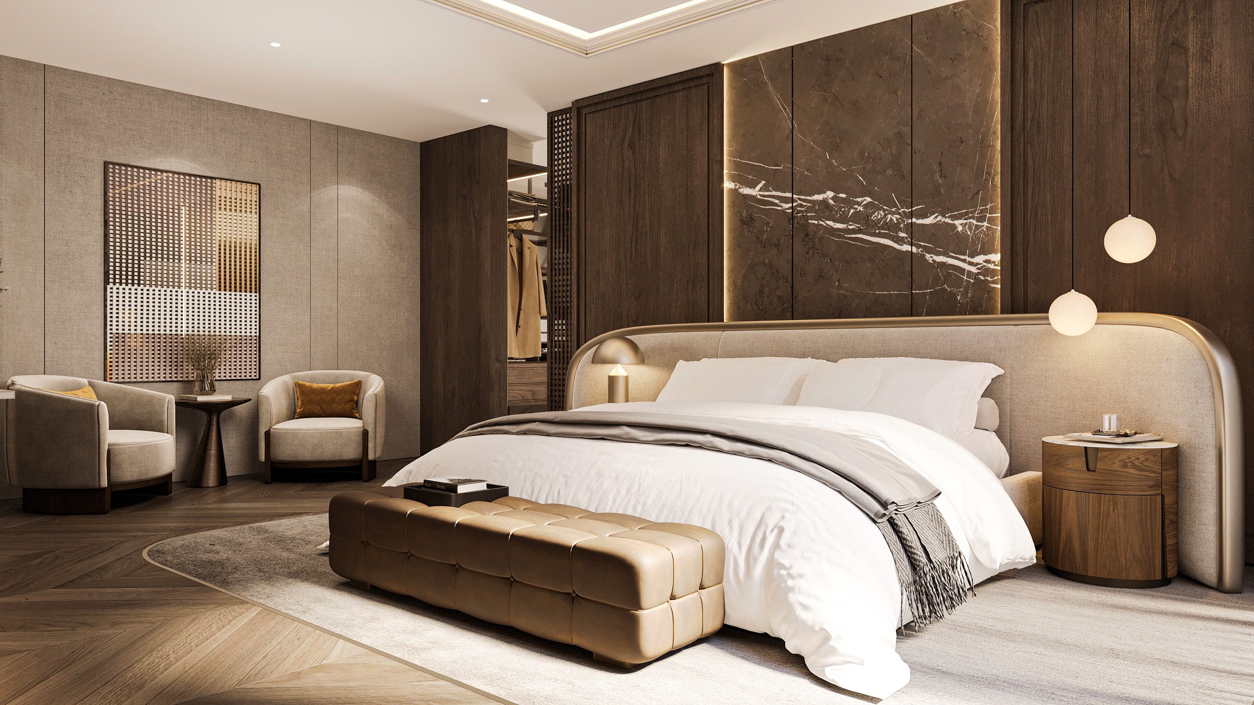 Warm wood finishes play a central role throughout the space, adding depth and continuity—from the custom wall paneling to the integrated kitchen and bedroom details. Subtle lighting design enhances textures and creates a soft, ambient glow, particularly in feature elements like the sculptural bathroom basin and backlit mirrors. Carefully curated furnishings in neutral tones bring balance and comfort, complementing the rich material palette. The result is a harmonious interior that blends classic proportions with modern living, where every detail feels intentional and quietly luxurious.